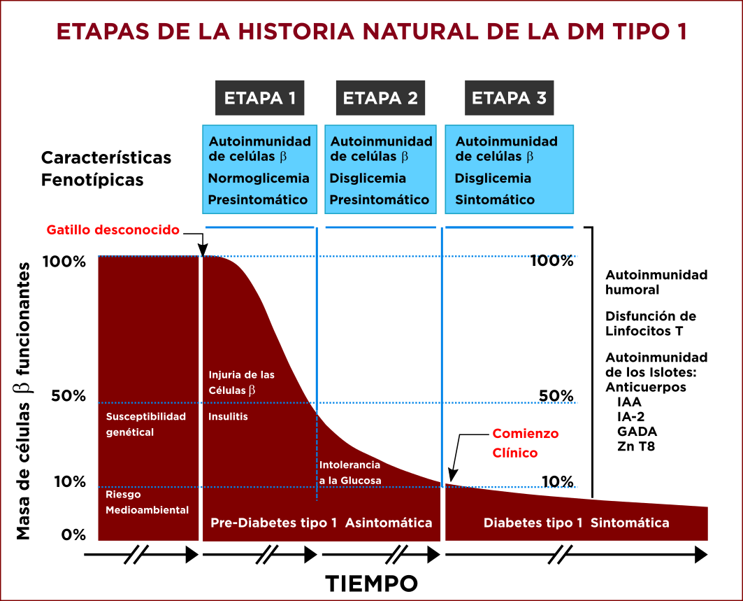 Comienza con el 100% de la masa de células betas. Por un gatillo, que se desconoce (probablemente relacionado con virus, tóxicos, eventos gestacionales, factores dietéticos: déficit de vitamina A y D o sobrepeso en adolescentes), se inicia la injuria de las células beta, por disfunción de Linfocitos T (CD8) y desarrollo de autoinmunidad humoral, con aparición de autoanticuerpos, que van destruyendo las células betas, es lo que se denomina Insulitis. Cuando la masa de células betas cae al 50%, se habla de Prediabetes tipo 1, lo único que se observa es una intolerancia a la glucosa o una glucosa alterada en ayunas. Cuando la masa de células betas disminuye al 10%, tenemos el comienzo clÃnico de la enfermedad (DM tipo 1).