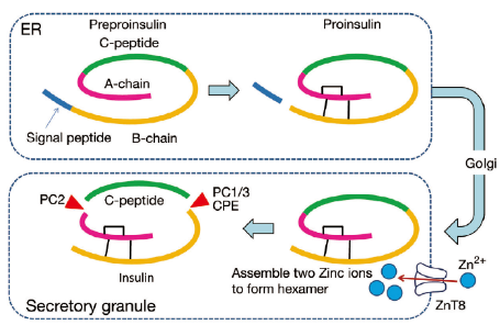 En el año 2007 fue descripto un nuevo autoantÃgeno: la isoforma 8 del transportador de Zn (ZnT8) especÃfico de célula beta. El ZnT8 participa en el transporte de Zn++ desde el citoplasma hacia el interior del gránulo de secreción de insulina. La presencia del catión es esencial para el almacenamiento de la insulina, como hexámero con dos cationes Zn++, y para la secreción de la hormona frente al estÃmulo de glucosa. La insulina se sintetiza en el retÃculo endoplasmico de las células betas de los islotes pancreáticos como una preprosinsulina, con la cadena A, el péptido de conexión, la cadena B y un péptido señal, el cual va ser hidrolizado, transformándose la molécula en la proinsulina luego de un cambio conformacional en donde se forman los tres puentes disulfuros que van a mantener unidas las cadenas A y B. La proinsulina luego de pasar por el Golgi, ingresa al gránulo de secreción de insulina, donde 6 moléculas de proinsulina se ensamblan con dos iones Zinc, para formar el hexámero de proinsulina. Esta proinsulina hexamérica se convierte en el hexámero de insulina por escisión del péptido C por la acción de enzimas proteolÃticas, conocidas como PC1/3 (prohormona convertasa 1/3), PC2 (prohormona convertasa 2) y CPE (Exoproteasa Carboxipentidasa E).