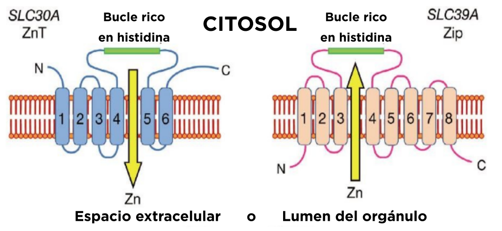 La homeostasis del Zinc está regulada por los transportadores de Zinc, ZnT (familia de genes SLC30A) y Zip (familia de genes SLC39A). Los ZnT transportan iones de Zinc desde el citoplasma a los espacios extracelulares o a la luz de los orgánulos, mientras que los Zips transportan el ion de zinc desde los espacios extracelulares o la luz de los orgánulos, al citoplasma. La mayorÃa de los transportadores de ZnT tienen seis dominios transmembrana, colas citoplasmáticas de amino y carboxilo-terminal, mientras que los transportadores ZIP tienen ocho dominios transmembrana, colas extra citoplasmáticas de amino y carboxilo-terminal.
