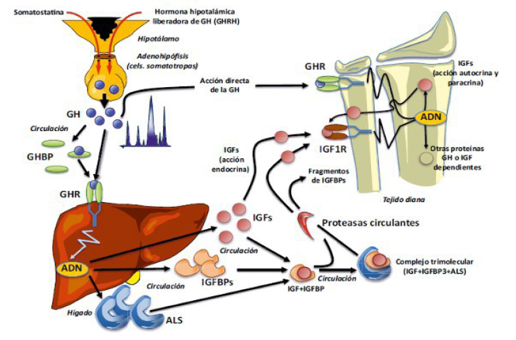 Se producen en hÃgado y en algunos tejidos periféricos como el músculo o hueso, y ejercen acciones anabolizantes y mitogénicas sobre las células. Circulan unidas a proteÃnas de transporte, las IGFBP (IGF binding proteins), la más importante desde el punto de vista clÃnico es la IGFBP3 ya que transporta del 75 - 90% de los IGFs circulantes. Otra proteÃna que se une al complejo es la ALS (subunidad-ácido-lábil) formando un complejo de alto peso molecular. Las ventajas de formar este complejo son que aumenta el tiempo de vida media sérica de los IGFs limitando la salida a los tejidos, y evitando los efectos hipoglucemiantes debido a la similitud con la insulina. La salida hacia los tejidos se realiza por la acción de proteasas circulantes que rompen lentamente estos complejos. Tanto las IGF como sus proteÃnas de transporte se sintetizan en el hÃgado permitiendo tener niveles constantes durante el dÃa, por lo cual su medida sirve como reflejo de los niveles de GH, al ser ésta última la que estimula su sÃntesis. Por el contrario la medida de los valores de GH basales no tienen utilidad diagnóstica ya que se libera de manera pulsátil.