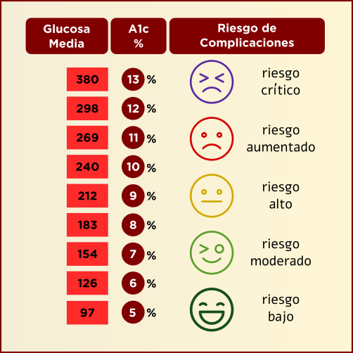 Los resultados de la prueba de A1C se presentan como porcentajes. Un porcentaje de HbA1c superior corresponde a niveles promedio de azúcar en sangre más elevados. Mientras más alto se encuentre el nivel de HbA1c, mayor será el riesgo de las graves complicaciones relacionadas con la diabetes.