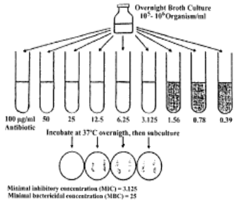 Dilución en caldo: Se procede a la dilución del antimicrobiano en una serie de tubos que contienen un caldo adecuado para el crecimiento del microorganismo que se va a ensayar. Se inocula el microorganismo, se incuba a una temperatura determinada y se determina la concentración del antimicrobiano que produce la inhibición del crecimiento del microorganismo.