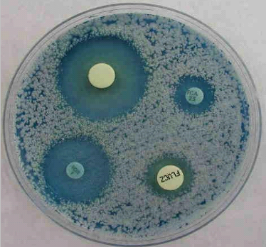 Difusión en agar con disco: Se inocula el microorganismo en la superficie del agar. Se deposita un disco con una concentración conocida de antimicrobiano. Se incuba a una temperatura adecuada. Se produce una zona de inhibición del crecimiento del microorganismo alrededor del disco. Dependiendo del tamaño de la zona, se puede determinar si el microorganismo es sensible, intermedio, indeterminado o resistente al antimicrobiano.