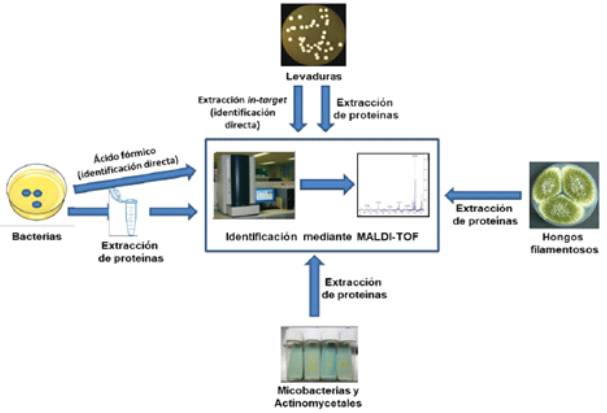- Espectrometria de masas (MALDI-TOF) ha permitido la identificación de microorganismos mediante el análisis de proteÃnas, principalmente ribosomales, a través de la creación de un espectro de masas que es especÃfico para cada género y especie. Un espectrómetro de masas se compone de tres unidades funcionales, una fuente ionizante para transferir iones a las moléculas de la muestra en una fase gaseosa, un analizador de masas que separa los iones de acuerdo con su relación masa/carga y un dispositivo de detección para monitorizar los iones separados.