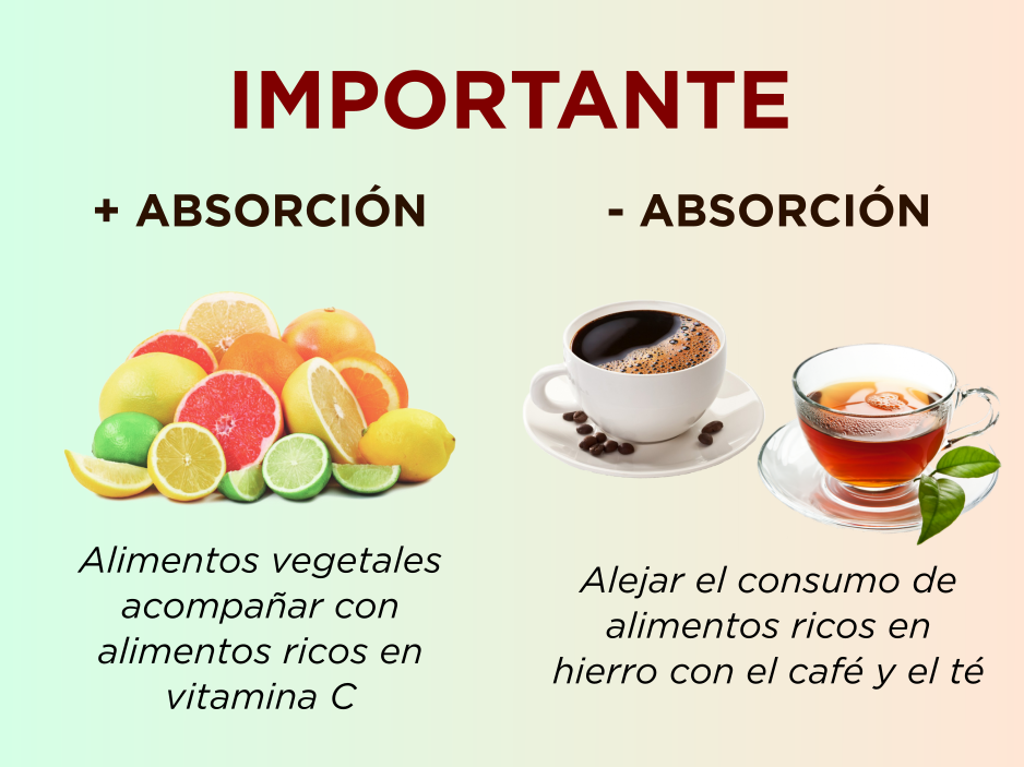 - La absorción del hierro aumenta en presencia de sustancias reductoras como el ácido ascórbico ó vitamina C, ácidos grasos saturados, el aceite de oliva.
