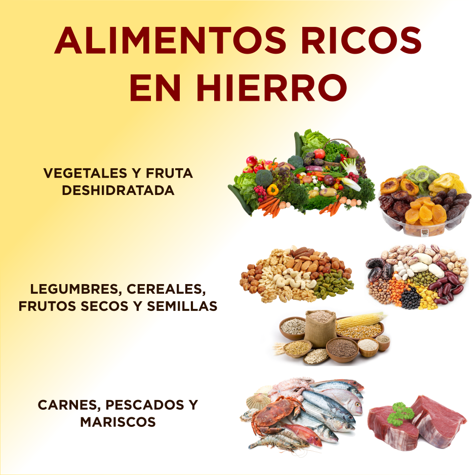 El hierro presente en los alimentos puede ser hemÃnico (hemo) y no hemÃnico (no hemo), siendo también dos las vÃas de absorción. El hierro hemÃnico está presente en alimentos de origen animal: pollo, pescado, carnes rojas siendo el de mayor absorción por el organismo. Todos los tipos de mariscos son ricos en hierro, especialmente las almejas, ostras y moluscos en general. Las carnes de órganos son muy nutritivas. Las más populares son el hÃgado, los riñones, el cerebro y el corazón. Todos ellos son buenas fuentes de hierro y contienen un 36% de IDR (Ingesta Diaria Recomendada) por ración. También son ricas en muchos otros nutrientes como el selenio, la vitamina A y la colina. La carne roja es una de las fuentes más accesibles de hierro hemo, también rica en vitaminas B, zinc, selenio y proteÃnas; nutricionalmente100g supone un 35% de IDR. El pavo proporciona un 13% de IDR en hierro y es una buena fuente de vitaminas y minerales.