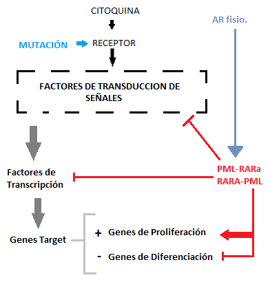 Es probable que las actividades anormales de estas proteÃnas de fusión resulten de la desregulación de las funciones de sus respectivos socios. En más del 95% de estas leucemias, se encuentra la t(15;17), la cual crea una PLM-RAR a la que se le atribuye una represión transcripcional oncogénica de los genes diana del ácido retinoico.