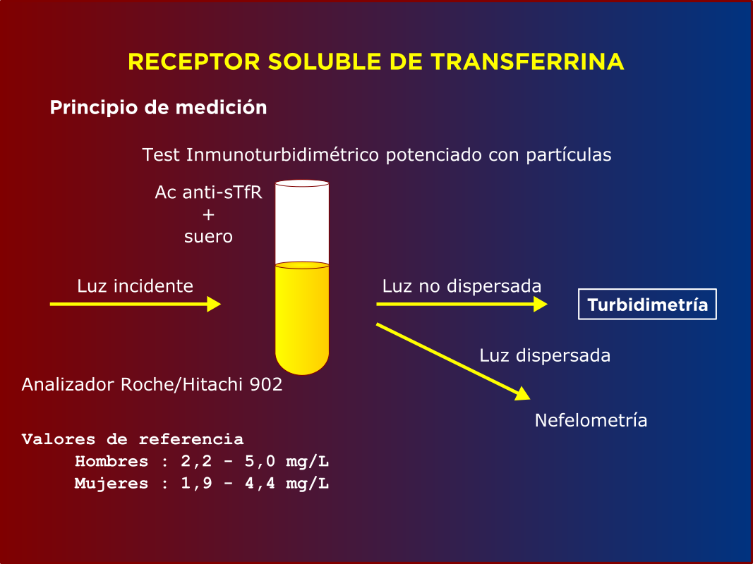 Este receptor tiene una alta sensibilidad y especificidad en la detección de la deficiencia de hierro. Este parámetro se eleva en deficiencia de hierro incluso antes de que la Hb tenga una reducción significativa; con la gran ventaja de que no se altera en los procesos infecciosos e inflamatorios agudos o crónicos como sà se alteran la ferritina sérica y la protopofirina libre eritrocitaria; sensibles a cambios circadianos y a la presencia de procesos agudos inespecÃficos. Por lo tanto, se propone la utilización de los receptores de transferrina como análisis bioquÃmico ideal para realizar el diagnóstico de deficiencia de hierro.