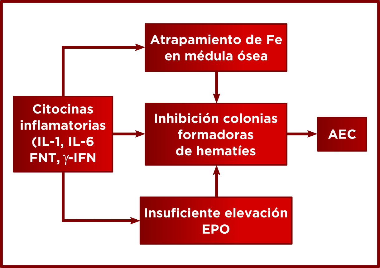 AEC. Anemia de enfermedades crónicas/ procesos inflamatorios. La circulación del Fe entre los compartimientos de depósito y de utilización constituye un ciclo muy eficiente y prácticamente cerrado y las concentraciones intracelulares del mismo están reguladas con gran precisión, porque tanto el exceso como la carencia de este mineral son nocivos para las células. La anemia se instaura por una desaceleración general de la eritropoyesis pues las citoquinas liberadas por los macrófagos tienen un efecto inhibidor sobre la eritropoyetina. Se origina una anemia normocÃtica de largo tiempo que cuando está muy evolucionada puede transformarse en microcÃtica, por retención de Fe por los macrófagos