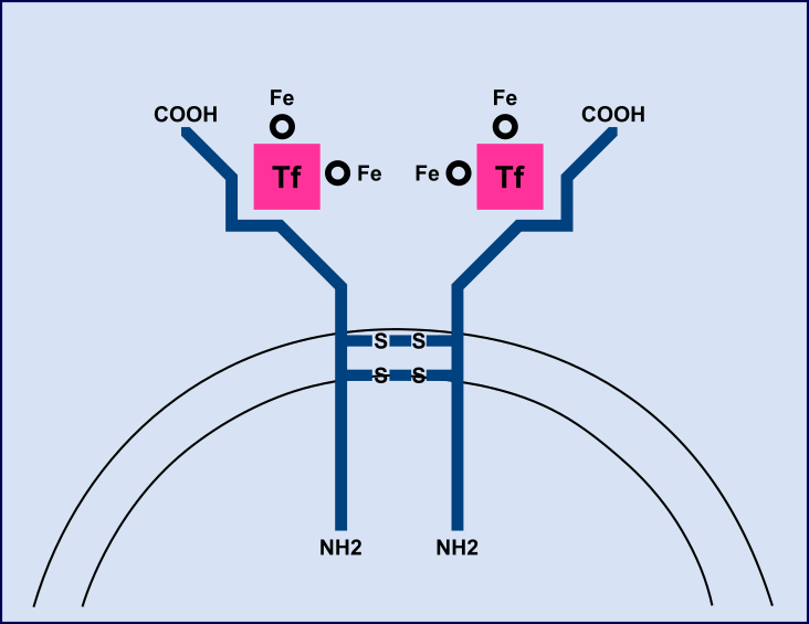 El receptor de transferrina es una glicoproteÃna dimérica transmembrana con un único puente disulfuro. Cada dÃmero es capaz de unir una molécula de transferrina diférrica a pH plasmático fisiológico. La internalización del complejo Fe-TRA-RTf es llevada a cabo por endocitosis. El N° total de RTf presentes en los eritroblastos en médula ósea es determinante para la captación de hierro. RTf sufre una proteólisis en un sitio especÃfico de su dominio extracelular dando lugar a dos monómeros (sRTf) cuya cc se mide en suero ó plasma. Existe una relación constante entre el N°total de RTf y la cc de sRTf circulante ó sea que la cc en suero ó plasma es una medida indirecta de la cantidad total de RTf.