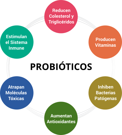 Cada individuo alberga 100,000 millones de microorganismos de 400 especies, en su mayorÃa bacterianas. Más del 95 % vive en el tracto digestivo, sobre todo en el colon. Es la llamada flora intestinal. En el útero materno, el feto vive en un ambiente estéril, sin gérmenes y en su intestino hay una ausencia total de agentes bacterianos. La concentración de las bacterias en el intestino aumenta a medida que el bebe crece pasando de la alimentación láctea a la mixta. Con el crecimiento la flora bacteriana se estabiliza. A lo largo de nuestra vida, según el tipo de alimentación que adoptemos y diversas condiciones intestinales, la población bacteriana sufrirá modificaciones tanto en cantidad como en calidad. Estas bacterias que forman la microbiota intestinal, proliferan en el interior del intestino grueso y fermentan diferentes elementos produciendo sustancias beneficiosas para la salud, intervienen en el desarrollo normal del sistema inmunitario y en la regulación de la respuesta del organismo ante los patógenos. La función de la microbiota intestinal es lograr una buena digestión, descomponer los alimentos y fortalecer el sistema inmunitario. Muchas veces dicha función de la microbiota puede verse alterada por diversas modificaciones, es aquà donde los "probióticos" juegan un papel muy importante actuando a nivel del tubo digestivo estabilizando la composición de la flora bacteriana e incrementando la resistencia del organismo frente a los patógenos, mejorando y activando las defensas produciendo vitaminas y enzimas digestivas.