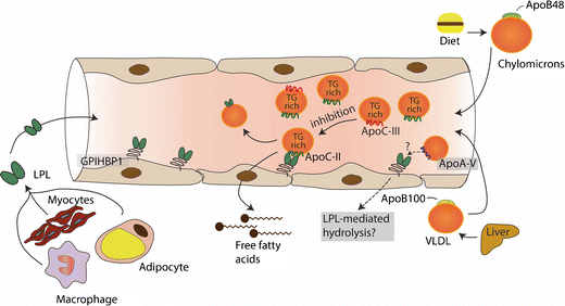 Los TG no pueden atravesar libremente las membranas celulares, como consecuencia la lipolisis es un proceso esencial para la liberación de ácido grasos en los tejidos y asà poder obtener energÃa. La LPL es la enzima clave para impulsar la hidrólisis de los TG a lo largo de la superficie luminal de los capilares y la proteÃna de unión a HDL glucosilfosfatidilinositol, recientemente identificada (GPIHBP1) proporciona la plataforma que permite que ocurra la lipolisis en la superficie de las células endoteliales. La LPL se sintetiza en macrófagos, adipocitos y miocitos, y debe transferirse al sitio luminal de la célula endotelial para activarse, un proceso facilitado por GPIHBP1. En condiciones de alimentación, la actividad de LPL es alta debido al efecto de la insulina, lo que resulta en una mayor absorción de ácidos grasos. La LPL está estrictamente regulada en el corazón y el músculo esquelético, ya que estos tejidos necesitan un suministro continuo de ácidos grasos para la producción de energÃa.