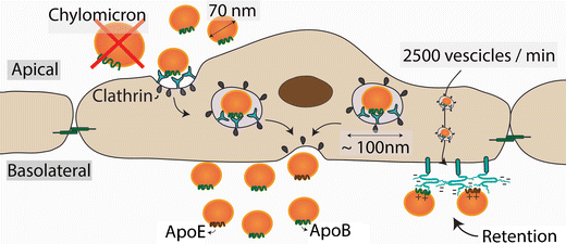 Las lipoproteÃnas en la circulación normalmente entran y salen de la pared arterial por transcitosis, un sistema de transporte en el que las lipoproteÃnas y otras macromoléculas se transportan a través de la célula endotelial en vesÃculas recubiertas con clatrina, estudios recientes indican que el proceso responde a los niveles de LDL en la sangre. Las vesÃculas de transporte tienen aproximadamente 100 nm de diámetro, por lo tanto, el sistema de transporte transcitótico está restringido a lipoproteÃnas de menos de 70 nm de diámetro, como son las VLDL más pequeñas, LDL, remanentes de TRL y HDL. Las lipoproteÃnas más grandes, como los QM y las partÃculas grandes de VLDL, no pueden atravesar el endotelio. Esta limitación de tamaño explica porque las personas con trastornos de acumulación de lipoproteÃnas grandes como los QM en paciente con deficiencia de LPL, no desarrollan aterosclerosis.
