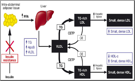 La hipertrigliceridemia favorece el intercambio de colesterol esterificado de la HDL madura y de la LDL por TG de la VLDL por medio de la enzima CETP. El resultado es una partÃcula de HDL y de LDL con mayor contenido de TG y menor de colesterol esterificado. Estas partÃculas, con mayor contenido de TG, sufren hidrólisis por parte de la enzima lipasa hepática originando una partÃcula más pequeña y densa (LDL pequeña y densa al igual que HDL pequeña). Además, la HDL pequeña es removida rápidamente de la circulación, resultando en una baja concentración de colesterol HDL y un menor nivel de ApoA-I, principal apolipoproteÃna de la HDL, y de partÃculas de HDL.